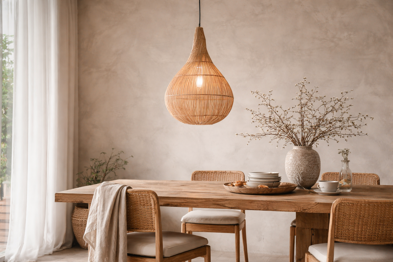 Our rattan pendant lampshades are produced in limited quantities and designed as shade-only pieces, allowing flexibility for custom electrical installations. Alongside lighting, we offer handcrafted dining furniture and organic home accents that bring warmth, texture, and authenticity to living spaces.
