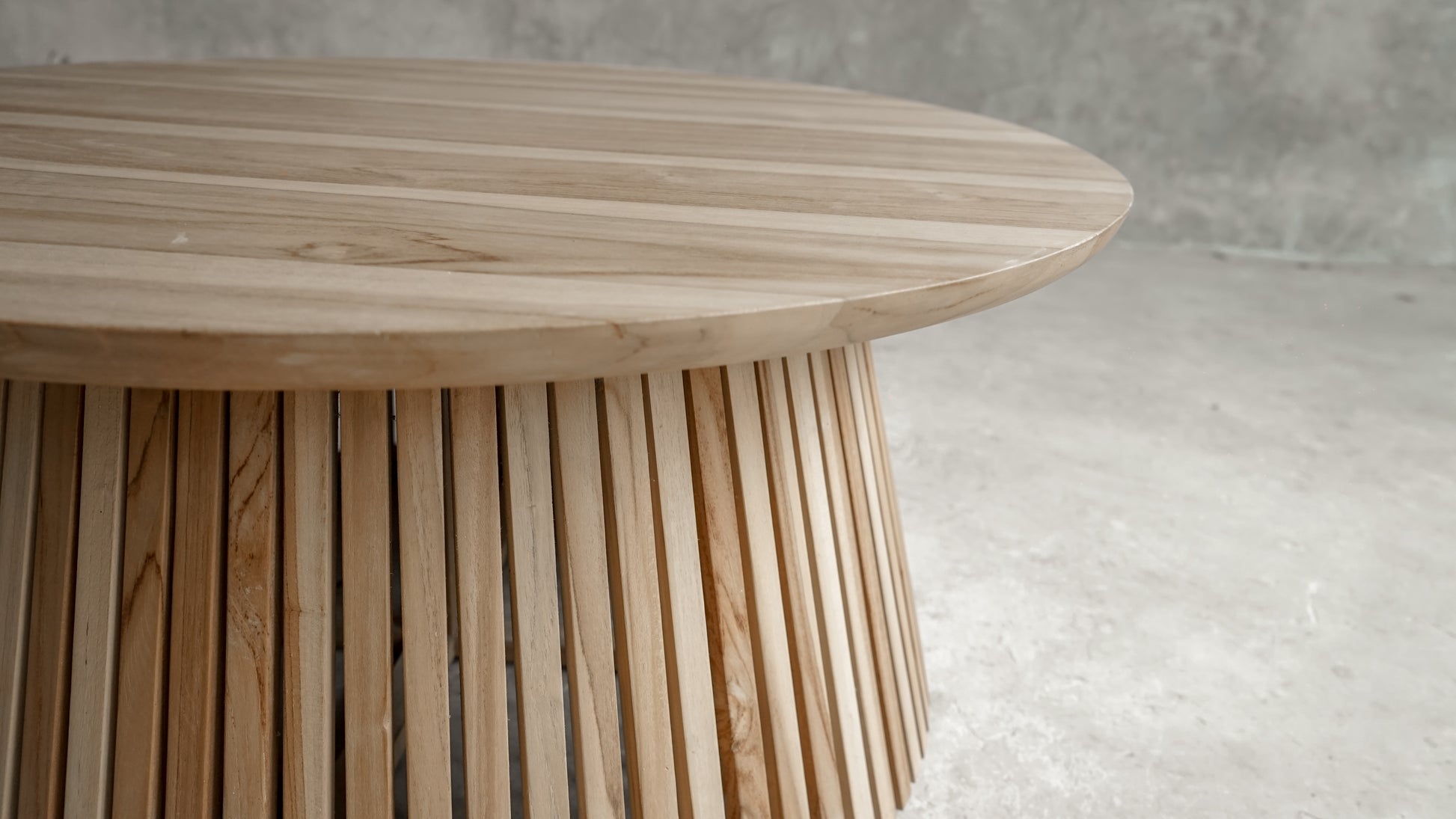 The Elton is defined by its stunning slatted pedestal base, featuring a rhythmic vertical wood design that creates a beautiful play of light and shadow. The oversized circular top provides a generous surface for styling, while the tapered silhouette ensures the piece feels light and airy despite its substantial footprint.