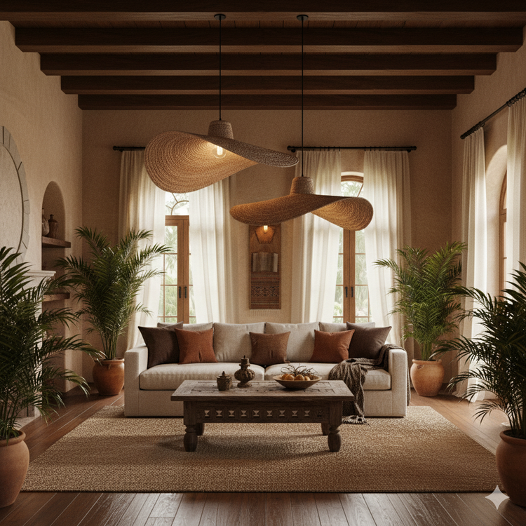 Available in two sizes — Large (35x35x20") and Medium (28x28x18") — the Celia Pendant works beautifully above dining tables, living spaces, or bedrooms, creating a soft, organic glow that enhances any natural setting.