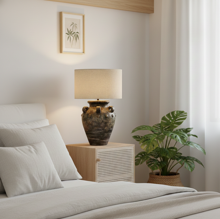 The Magnolia is a masterclass in texture and form, designed for those who appreciate the quiet beauty of natural materials. The base is expertly crafted from premium terracotta, featuring a rhythmic, hand-etched ribbed pattern that adds depth and tactile interest to any surface. Its earthy, neutral tone is perfectly balanced by a crisp, natural linen drum shade, which diffuses light to create a serene, resort-like ambiance.